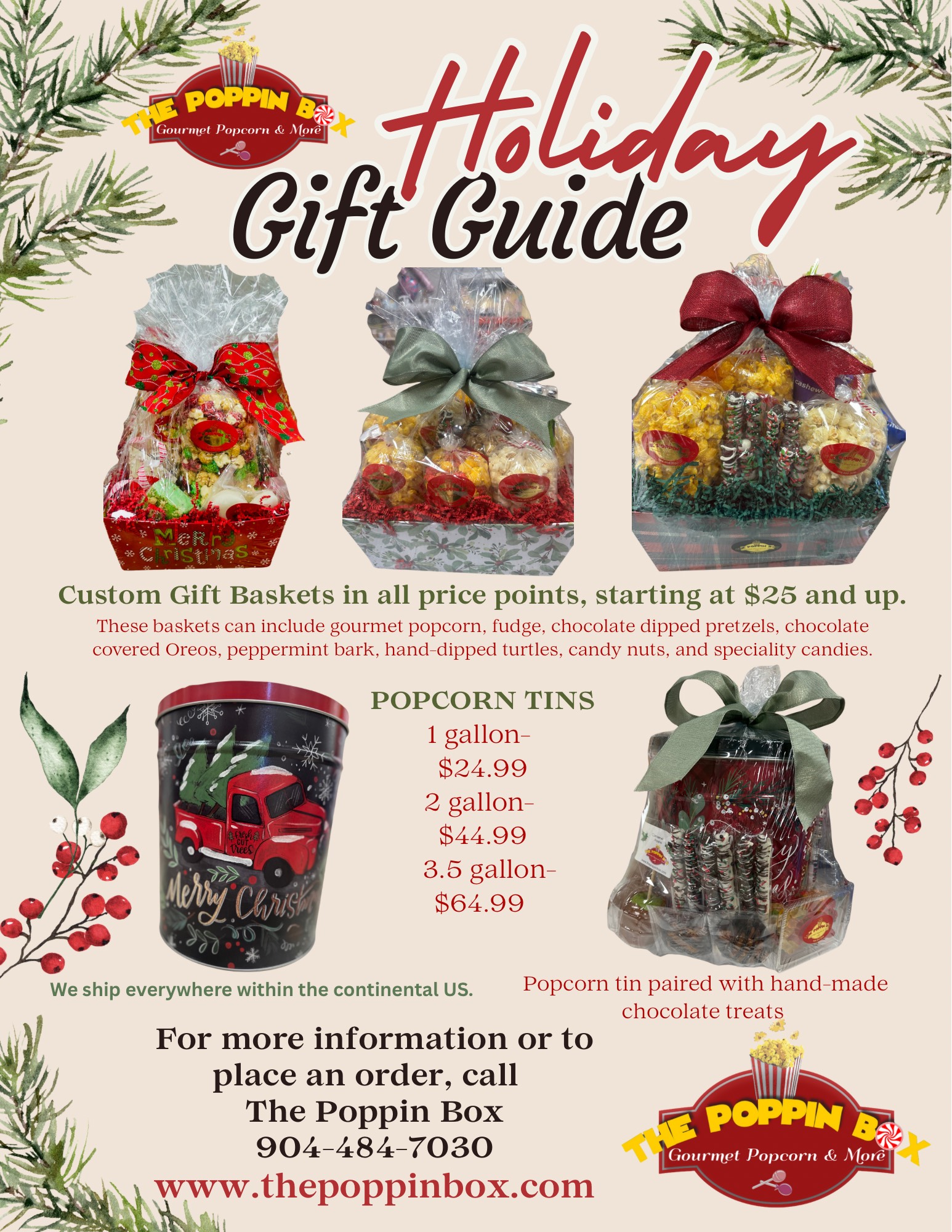The Poppin’ Box LLC is a gourmet popcorn shop near Saint Johns, FL. Our little family owned shop offers over 60 flavors of freshly popped popcorn, old-fashioned candy, delicious fudge, and specialty sodas. We have candy that will take our mature kids back in time as well as the latest sours that make the youth smile with a pucker!! Our soda selection is a unique mix of root beer, cherry, orange, creams and everything in between. When you step into our shop your eyes will light up with delight as our colorful shop is filled with yummy treats from ceiling to floor. Take a treat home or send one of our gift sets or tins to a loved one afar. Our popcorn is available nationwide.