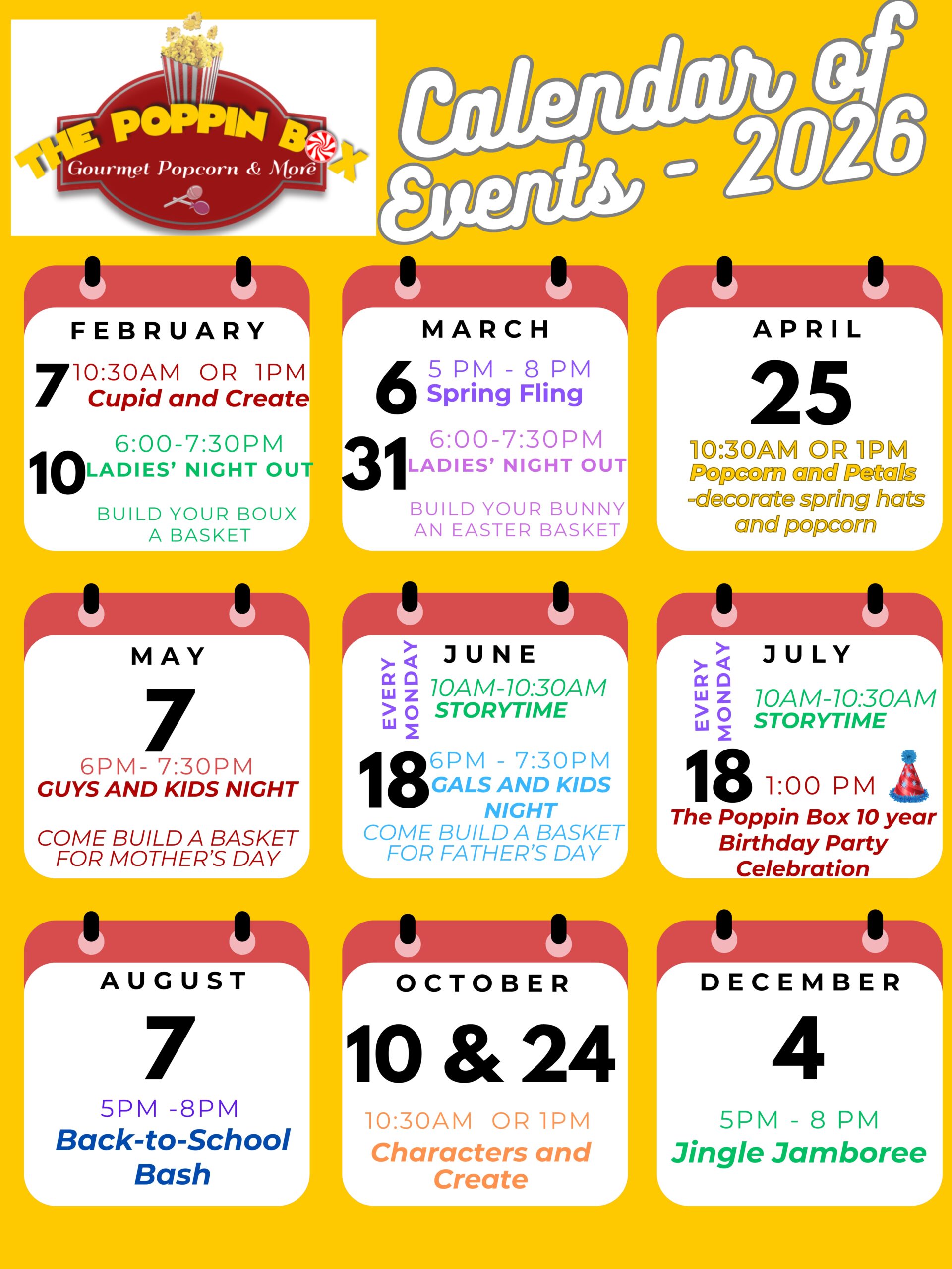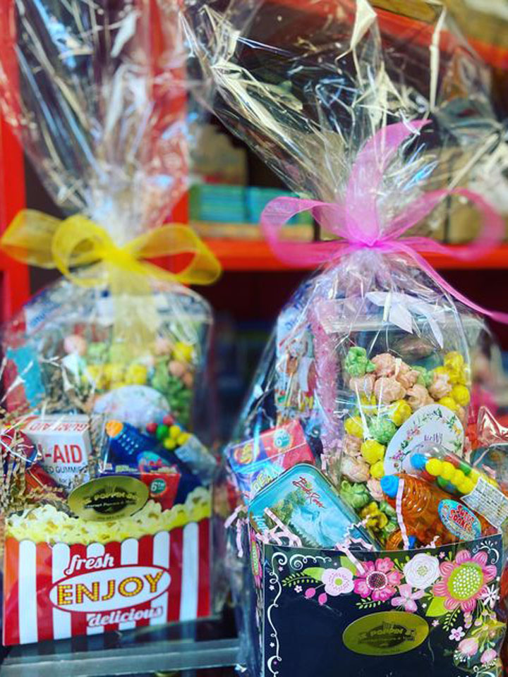 The Poppin’ Box LLC is a gourmet popcorn shop near Saint Johns, FL. Our little family owned shop offers over 60 flavors of freshly popped popcorn, old-fashioned candy, delicious fudge, and specialty sodas. We have candy that will take our mature kids back in time as well as the latest sours that make the youth smile with a pucker!! Our soda selection is a unique mix of root beer, cherry, orange, creams and everything in between. When you step into our shop your eyes will light up with delight as our colorful shop is filled with yummy treats from ceiling to floor. Take a treat home or send one of our gift sets or tins to a loved one afar. Our popcorn is available nationwide.